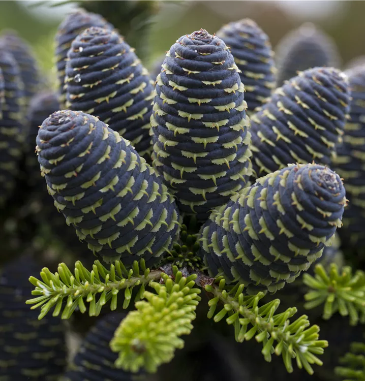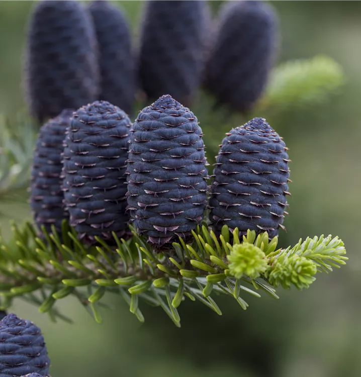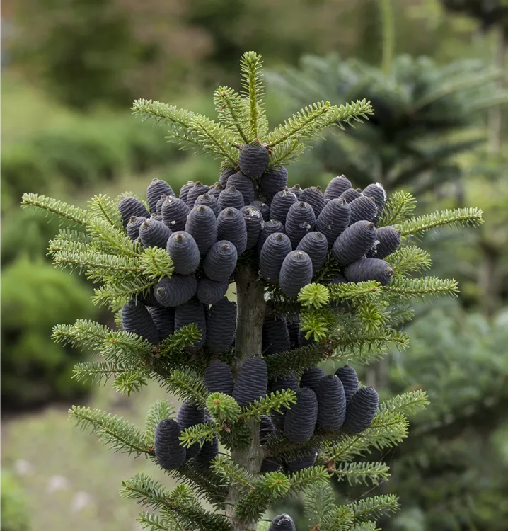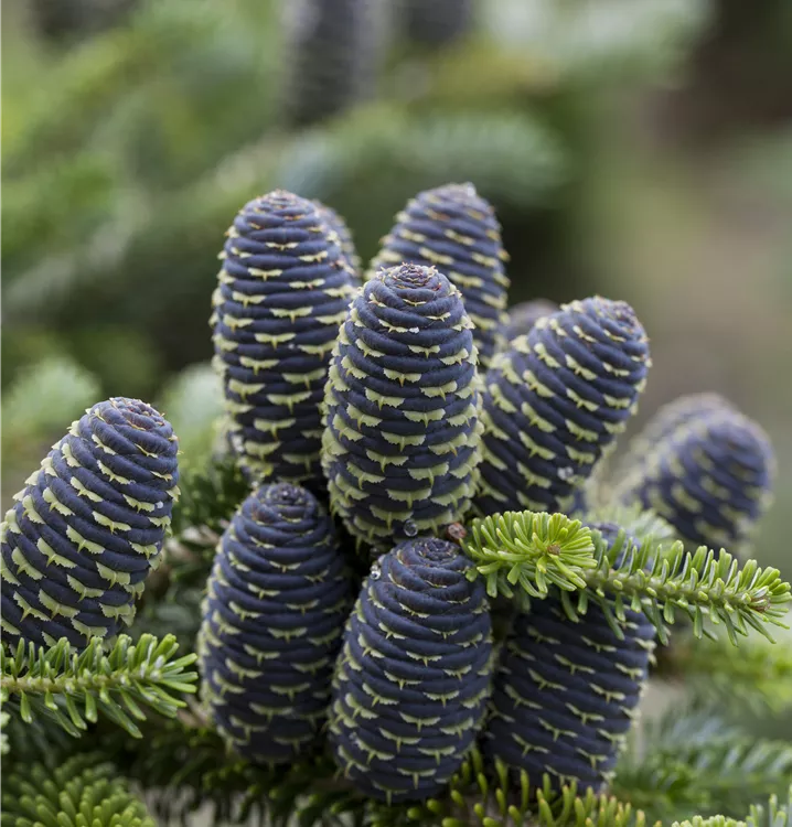 Die Koreatanne (Abies koreana) trägt immergrüne Nadeln, die eine schöne mittelgrüne Farbe haben. Ab März bringt sie dunkelblaue Blüten hervor, aus denen sich zu Oktober zierene, dunkelbraune, zylindrische Zapfen entwickeln. Als pyramidaler Baum mit Krone erreicht die Koreatanne Grössen von bis zu 10 m Höhe und 4,5 m Breite. Am besten kommt sie zur Geltung, wenn Sie ihr einen sonnigen bis halbschattigen Standort geben, optimalerweise mit humosem, nährstoffreichem, schwachsaurem Boden und einer ausreichenden Wasserversorgung.