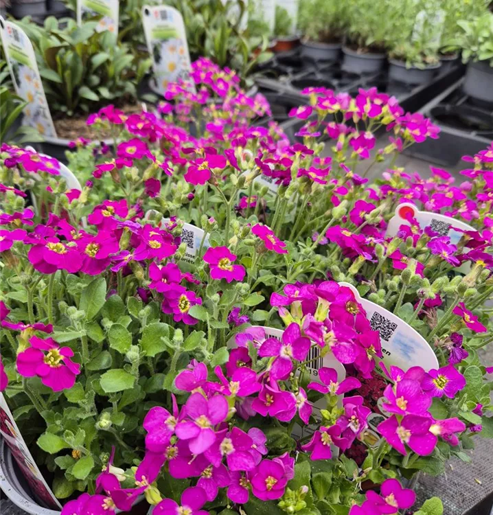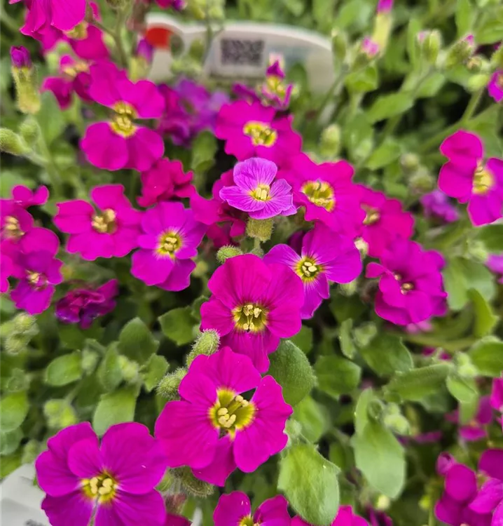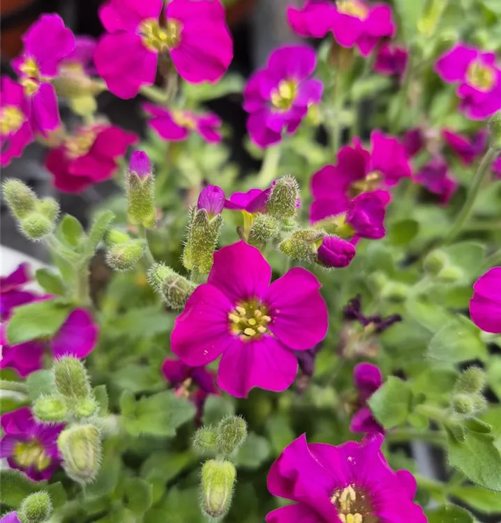 Beet und Rabatten lassen sich mit dem Blaukissen 'Axcent® Burgundy' (Aubrieta) attraktiv gestalten. Dafür sorgen seine radförmigen Blüten, die von März bis April in schönstem Bordeauxrot erscheinen. Abgerundet wird seine Erscheinung durch die lanzettlichen, mittelgrünen Blätter. Besonders geeignet ist das Blaukissen 'Axcent® Burgundy' für sonnige bis halbschattige Standorte. Pflanzen Sie es in durchlässige, nährstoffreiche Erde und sorgen Sie immer für genügend Wasser, dann entwickelt sich diese Staude zu einem schönen, etwa 15 cm hohem und 60 cm breiten, kissenförmigen, polsterbildenden Exemplar.