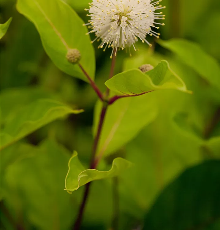 Der Knopfbusch (Cephalanthus occidentalis) trägt lanzettliche, ganzrandige, sommergrüne Blätter, die eine schöne mittelgrüne Farbe haben. Im Herbst färben sie sich hingegen orangegelb. Zwischen Juli und August bringt er cremeweisse, ballförmige Blüten hervor. Als buschiger, breiter Strauch erreicht der Knopfbusch Grössen von bis zu 2 m Höhe und 2 m Breite. Am besten kommt er zur Geltung, wenn Sie ihm einen sonnigen Standort geben, optimalerweise mit durchlässigem, nährstoffreichem Boden und einer ausreichenden Wasserversorgung.