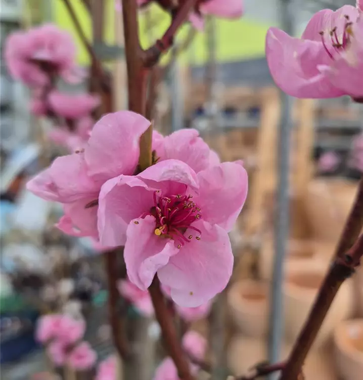 Als Saft oder einfach frisch als Snack, die süssen Früchte der Säulennektarine 'Alice-Col'® (Prunus persica) sind selbst geerntet natürlich besonders lecker. Ab August ist es soweit und die Früchte sind reif für die Ernte. Ihre glatte Schale ist dann dunkelrot gefärbt und verbirgt ein gelbes, gut steinlösendes Fruchtfleisch. Für eine reiche Ernte und leckere Früchte sollten Sie der Säulennektarine 'Alice-Col'® einen sonnigen Standort geben. Optimal ist dabei eine durchlässige, humose, nährstoffreiche Erde und natürlich auch eine ausreichende Wasserversorgung. Mit dem säulenförmigen Wuchs wird diese Pflanze etwa 3 m hoch und 1 m breit. Noch zu erwähnen sind auch die rosafarbenen Blüten der Säulennektarine 'Alice-Col'®. Diese erscheinen im April und sind nicht nur ein schöner Anblick, sondern auch eine Nahrungsquelle für Bienen und andere Insekten.