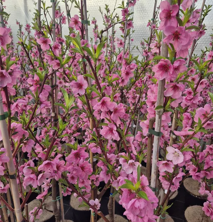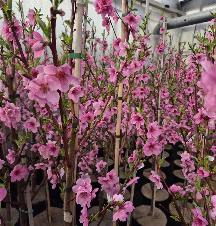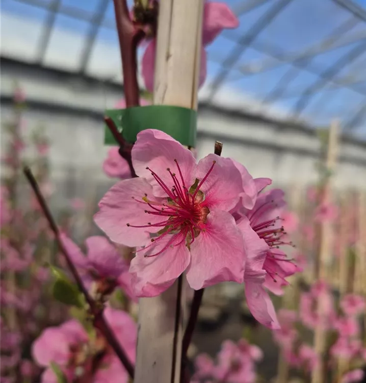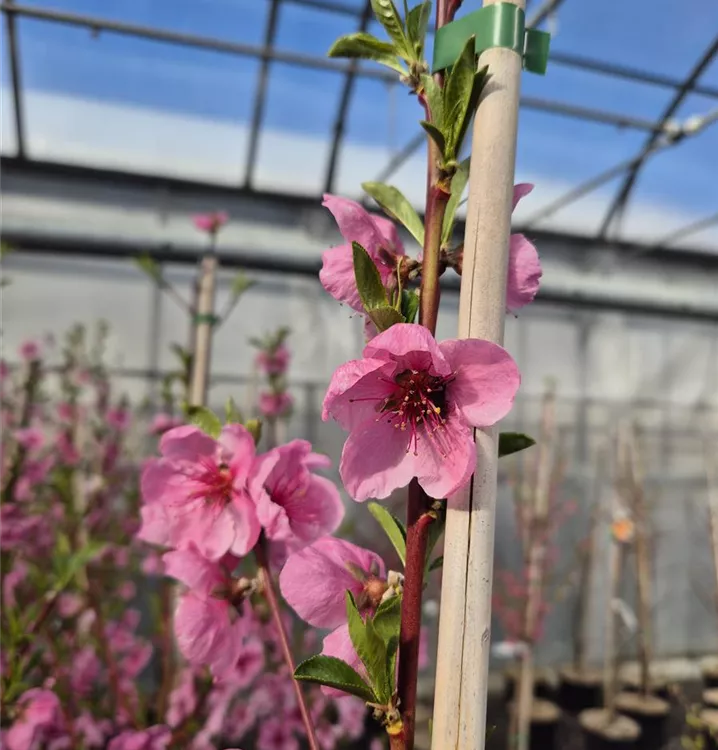 Als Saft oder einfach frisch als Snack, die Früchte der Tellernektarine (Prunus persica) sind selbst geerntet natürlich besonders lecker. Ab Juli ist es soweit und die flachen Früchte sind reif für die Ernte. Ihre glatte Schale ist dann gelb-rot gefärbt und verbirgt ein festes Fruchtfleisch. Für eine reiche Ernte und leckere Früchte sollten Sie der Tellernektarine einen sonnigen Standort geben. Optimal ist dabei eine durchlässige, humose, nährstoffreiche Erde und natürlich auch eine ausreichende Wasserversorgung. Mit dem aufrechten Wuchs wird diese Pflanze etwa 5 m hoch und 5 m breit. Noch zu erwähnen sind auch die rosafarbenen Blüten der Tellernektarine. Diese erscheinen im April und sind nicht nur ein schöner Anblick, sondern auch eine Nahrungsquelle für Bienen und andere Insekten.
