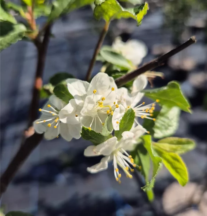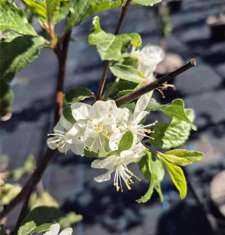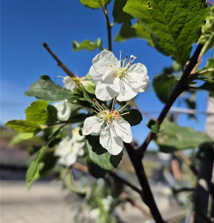 Die Säulen-Zwetschge 'Liane' schätzt eine regelmässige Wasserversorgung, die Erde darf aber auch mal antrocknen.
