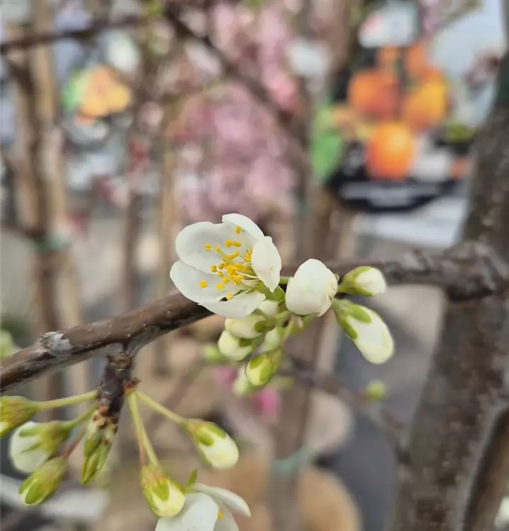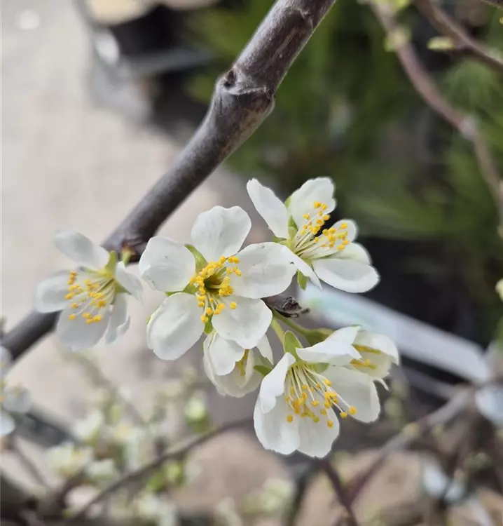Als Saft, in Marmeladen, für Kuchen oder einfach frisch als Snack, die süssen, aromatischen Früchte der Säulenzwetschge 'Pruntop' (Prunus domestica) sind selbst geerntet natürlich besonders lecker. Ab August ist es soweit und die Früchte sind reif für die Ernte. Sie sind dann purpurviolett bis blau gefärbt und haben ein gelbes Fruchtfleisch. Für eine reiche Ernte und leckere Früchte sollten Sie der Säulenzwetschge 'Pruntop' einen sonnigen bis halbschattigen Standort geben. Optimal ist dabei eine durchlässige, humose Erde und natürlich auch eine ausreichende Wasserversorgung. Mit dem säulenförmigen Wuchs wird diese Pflanze etwa 3 m hoch. Noch zu erwähnen sind auch die weissen Blüten der Säulenzwetschge 'Pruntop'. Diese erscheinen von April bis Mai und sind nicht nur ein schöner Anblick, sondern auch eine Nahrungsquelle für Bienen und andere Insekten.