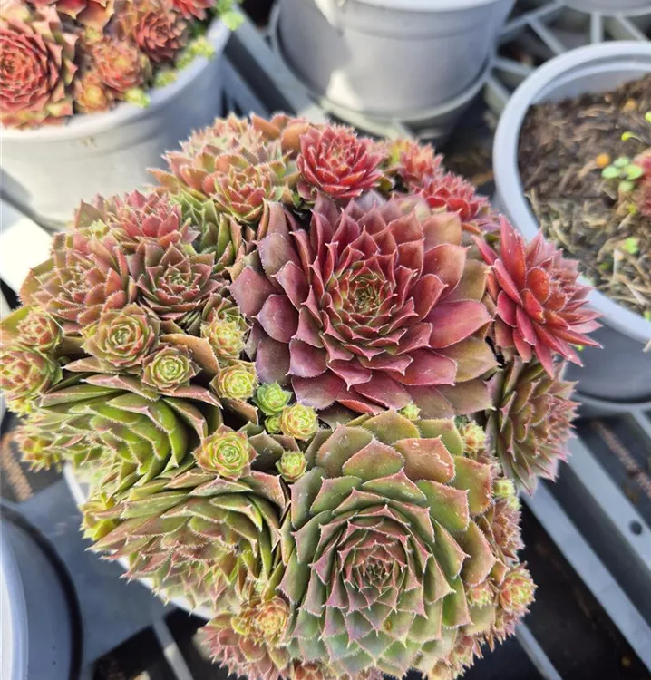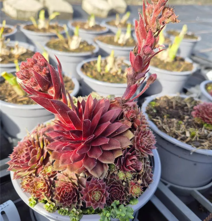 Die Spinnwebige Steinrose 'Rubin' ist eine polsterbildende, rosettenartige Pflanze. Sie erreicht eine Höhe von 5 - 15 cm, bei einer Breite von 15 - 20 cm.