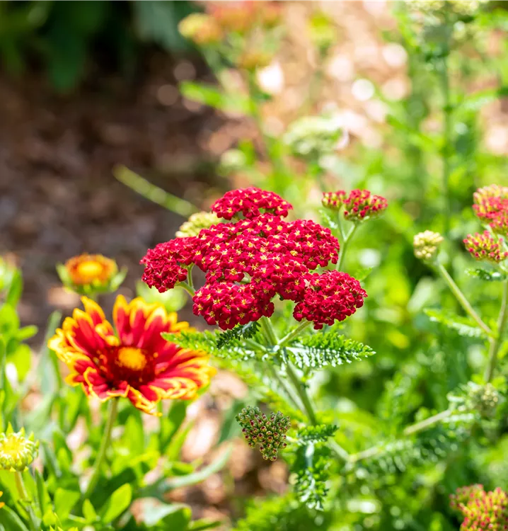 Vous pouvez particulièrement bien associer la Schafgarbe 'Skysail Fire' à la chicorée sauvage, mais la sauge des prés s'y marie aussi très bien.