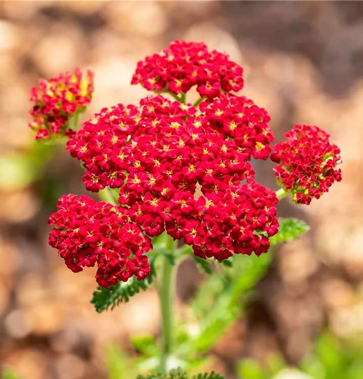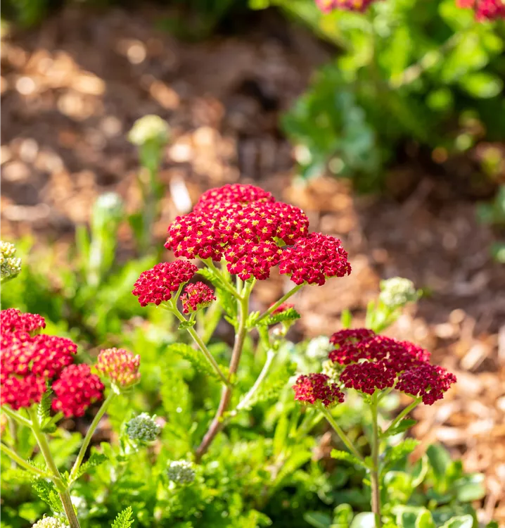 Les plates-bandes et les bordures peuvent être aménagées de manière attrayante avec l'Schafgarbe 'Skysail Fire' (Achillea millefolium). Ses fleurs, qui apparaissent de mai à juin dans un beau rouge, y veillent. D'ailleurs, elles n'attirent pas seulement le regard, car elles répandent un agréable parfum. Leur apparence est complétée par des feuilles plumeuses mates de couleur vert moyen. L'Schafgarbe 'Skysail Fire'@ convient particulièrement aux endroits ensoleillés. Plantez cette plante vivace dans un sol perméable et meuble et veillez à ce qu'elle soit toujours suffisamment arrosée. Elle se développera alors en un beau spécimen érigé d'environ 25 cm de haut et 30 cm de large.
