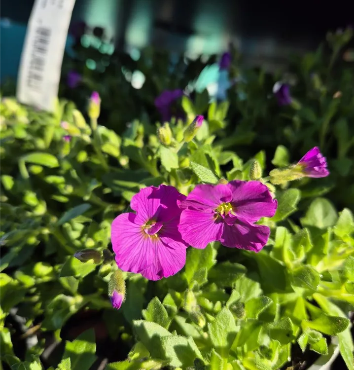 Les plates-bandes et les bordures peuvent être aménagées de manière attrayante avec l'Blaukissen 'Axcent® Antique Rose' (Aubrieta). Ses fleurs en forme de roue, qui apparaissent de février à avril, sont d'un beau rose. Son apparence est complétée par des feuilles lancéolées de couleur vert moyen. L'Blaukissen 'Axcent® Antique Rose'@ convient particulièrement bien aux endroits ensoleillés ou semi-ombragés. Plantez-la dans une terre perméable et riche en nutriments et veillez à ce qu'elle soit toujours suffisamment arrosée. Cette plante vivace se développera alors en un beau spécimen d'environ 15 cm de haut et 60 cm de large, en forme de coussin et formant des coussins.