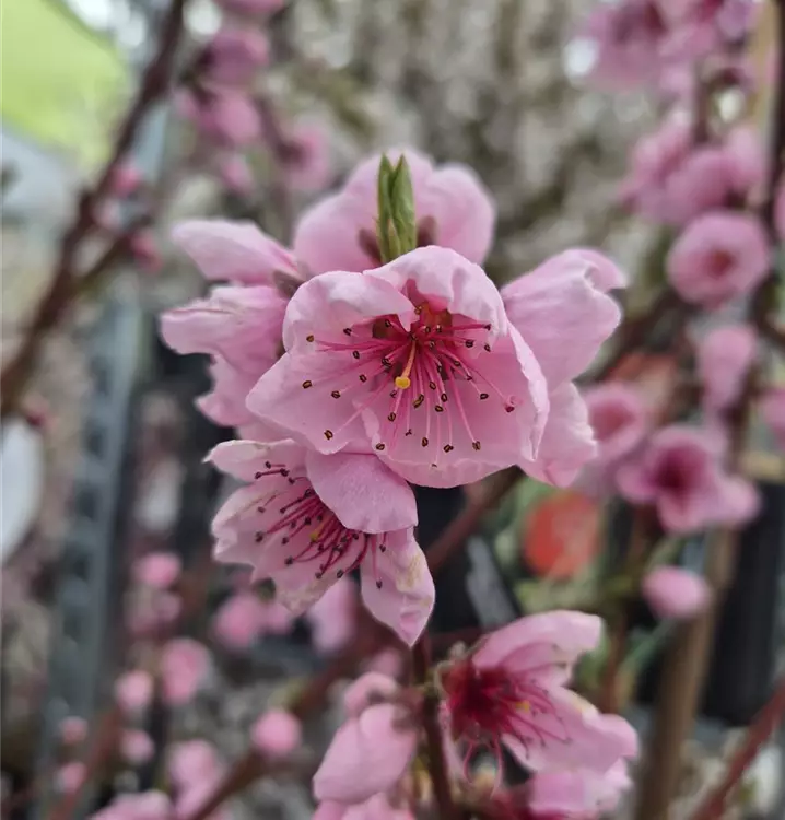 Sous forme de jus ou simplement frais comme en-cas, les fruits sucrés du Pêcher 'Nectared 4' (Prunus persica) sont bien sûr particulièrement délicieux lorsqu'ils sont récoltés par soi-même. À partir du mois d'août, les fruits ronds sont mûrs pour la récolte. Leur peau lisse est alors de couleur rouge et cache une pulpe jaune. Pour une récolte abondante et des fruits savoureux, il faut donner à la Pêcher 'Nectared 4' un emplacement ensoleillé. L'idéal est une terre perméable, riche en humus et en nutriments, et bien sûr un apport d'eau suffisant. Avec son port érigé, cette plante atteint environ 5 m de haut et 5 m de large. Il faut également mentionner les fleurs roses de Pêcher 'Nectared 4'. Celles-ci apparaissent de mars à avril et ne sont pas seulement un beau spectacle, mais aussi une source de nourriture pour les abeilles et autres insectes.